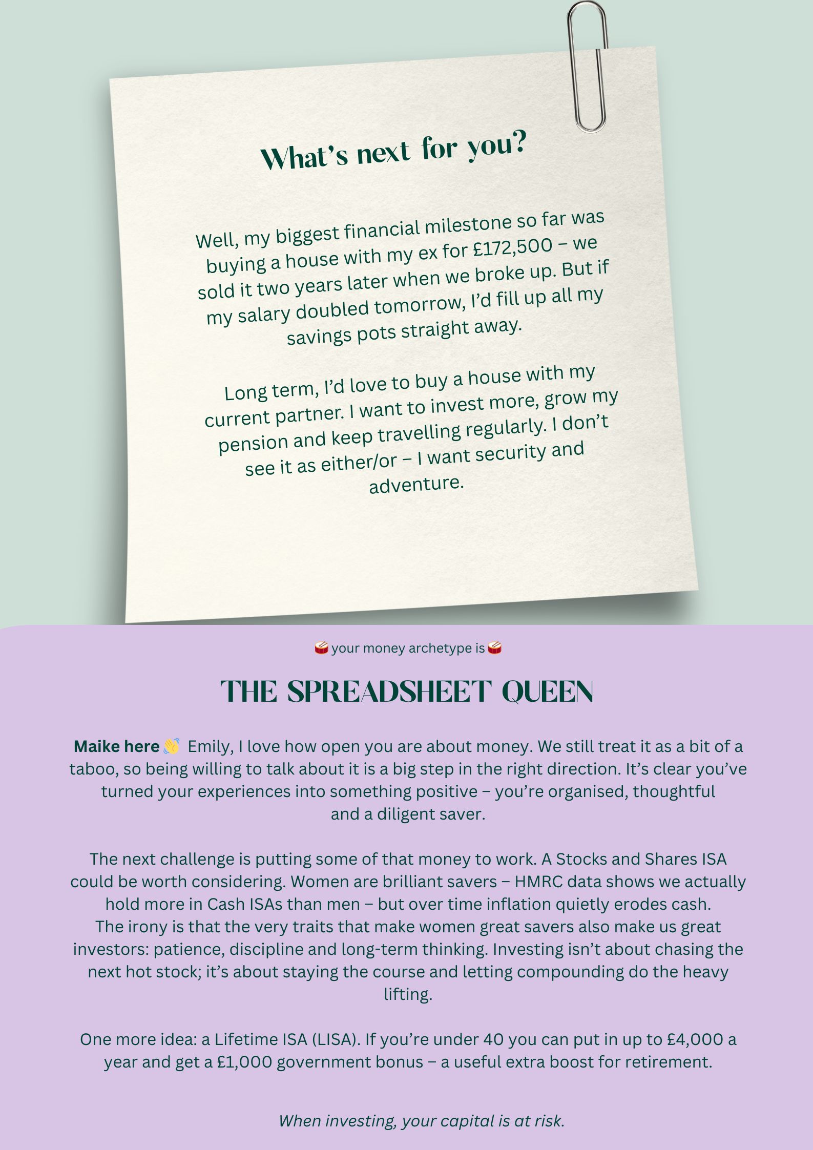 Welcome to Money Archetypes – a new series lifting the lid on the often mysterious world of money. Each week, someone from our community shares their real-life numbers, habits and goals – the good, the messy and everything in between – because there’s no one “right” way to do finances. We’ve partnered with Maike Currie, an advocate for improving women’s financial resilience and VP Personal Finance at PensionBee, to help us out. Anything discussed should not be regarded as financial advice and as always with investing, your capital is at risk.